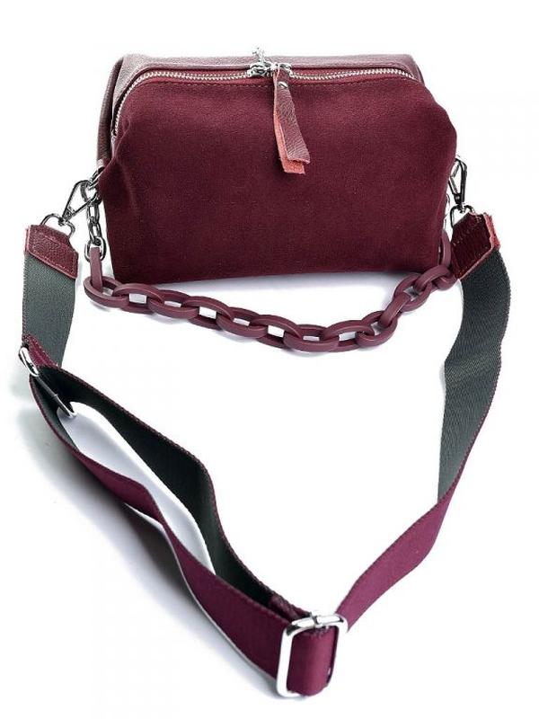 натуарльнеая кожа, замшевый фасад. Застегивается на молнию. Внутри карман на молнии и открытый карман под кошелек или телефон. В комплекте ручка и длинный регулируемый ремень. Фурнитура - серебро.Состояние: НовоеЦвет:- Бордовый