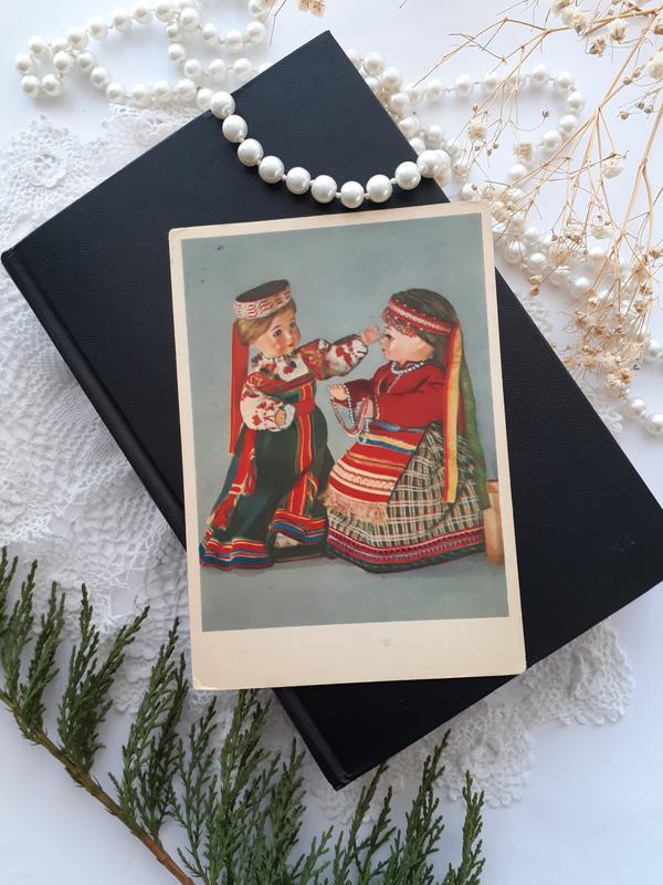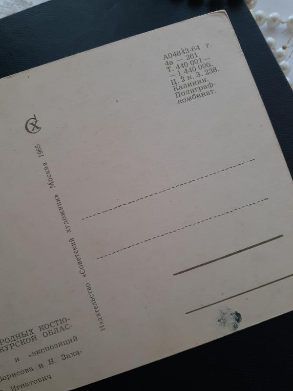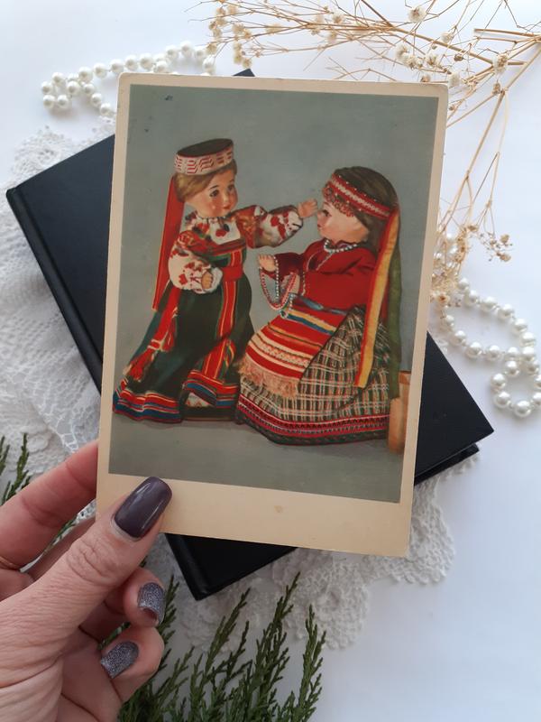 Открытка из серии "Куклы в народных русских костюмах". Автор костюмов и экспозиции Р. Спасская. Выпущенная московским издательством "Советский художник" в 1965 году.