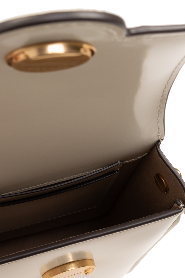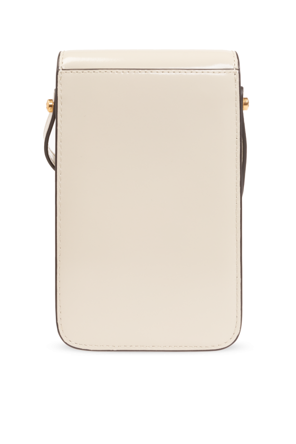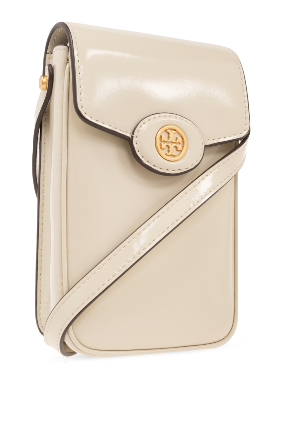 Cream ‘Robinson’ phone pouch from Tory Burch. Made of polished leather, this design features a magnetic closure with a metal logo detail, back pocket, adjustable strap, gold-tone metal hardware and one internal compartment with two card slots.