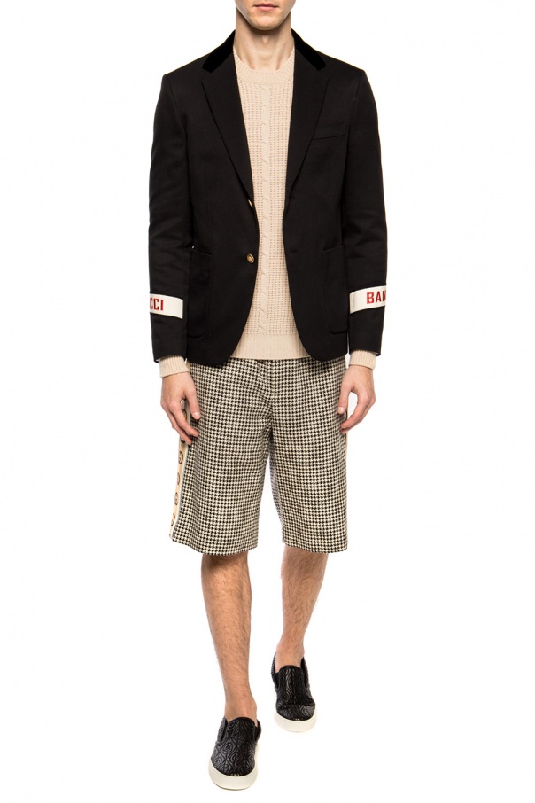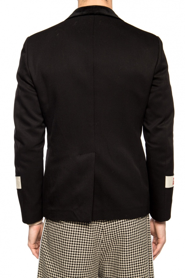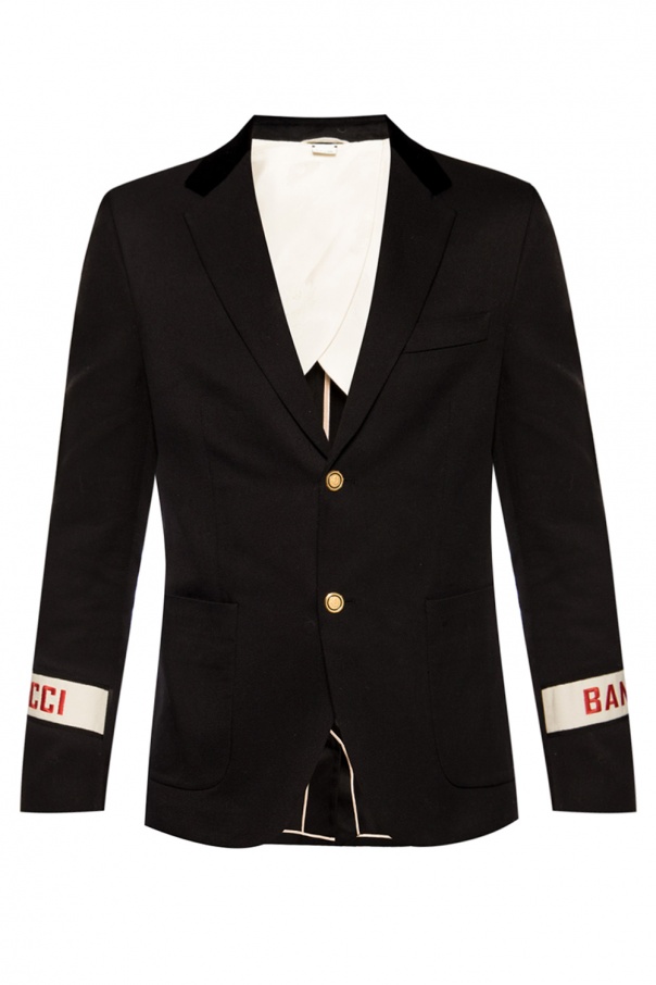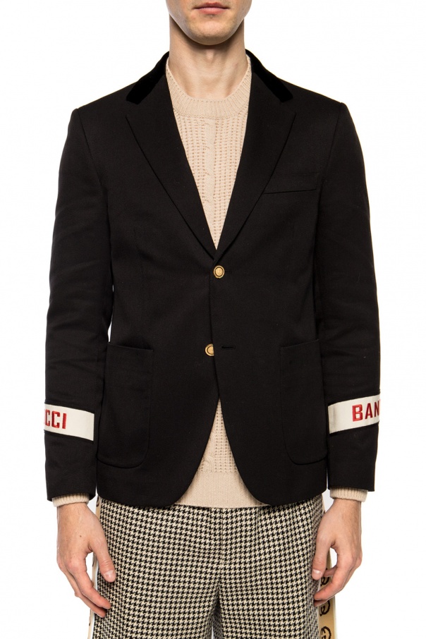 Black blazer with notch lapels from Gucci. Made of cotton. Fastened with buttons on the front. Decorated with sewn-in straps in beige and red. Single rear vent.