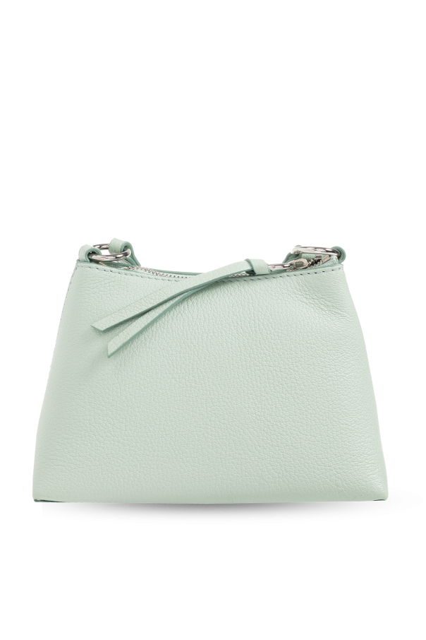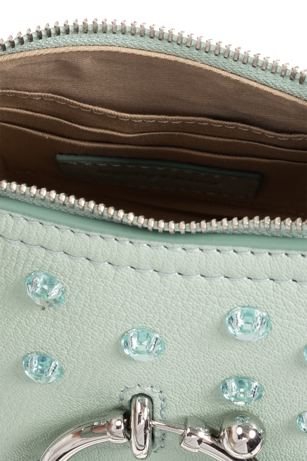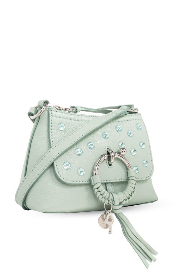 Greenish blue ‘Joan Mini’ shoulder bag from See By Chloe. Crafted from goat leather with rhinestones, this model features a zip fastening, front pocket with a flap and round closure with woven details and logo charms, adjustable shoulder strap, detachable wrist strap, silver-tone metal hardware and one internal compartment with three card slots.