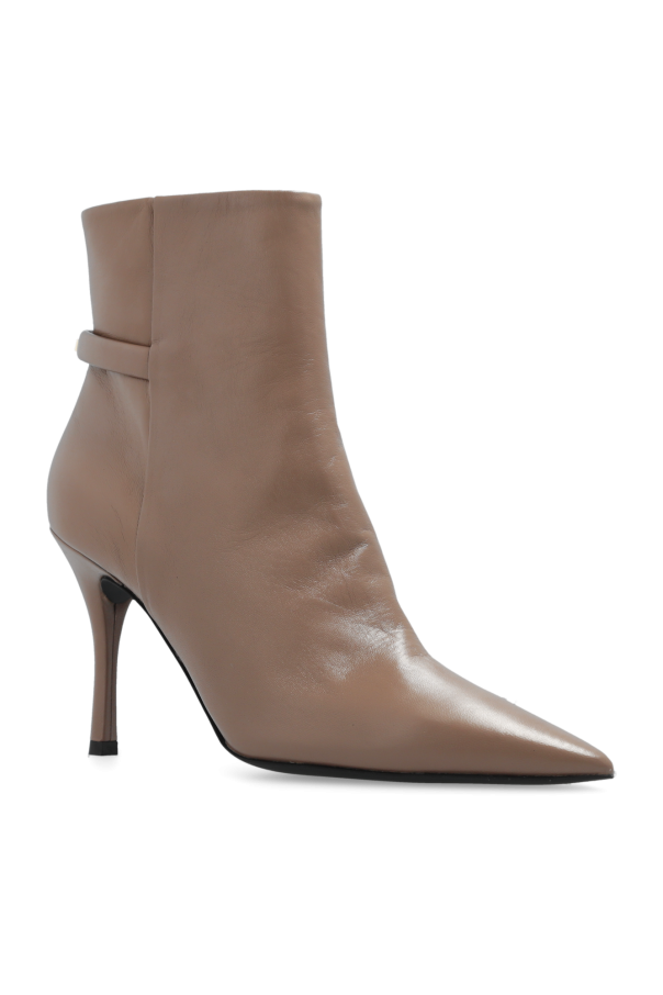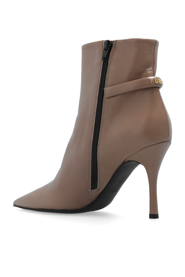 Brown ‘Core’ heeled ankle boots from Furla. Made from leather with a pointed toe silhouette, this model sits on a black rubber sole and features a zip fastening and a gold-tone logo on the back strap.