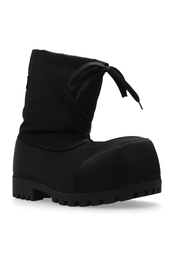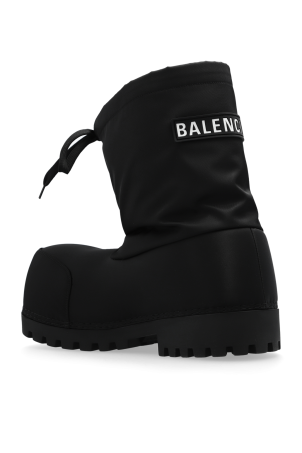 Black ‘Alasca Low’ snow boots from Balenciaga. Fastened with drawstrings, this pair is decorated with a rubber logo patch in black and white at the back and is set on a chunky sole in black rubber.