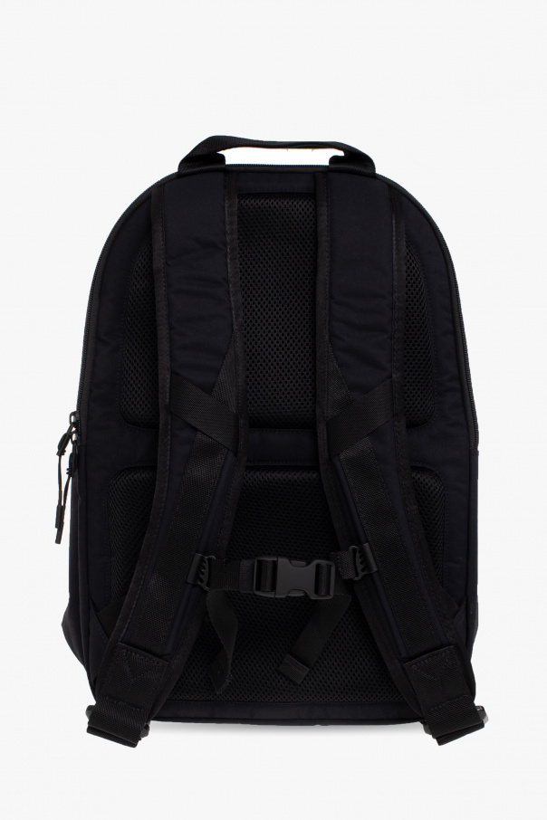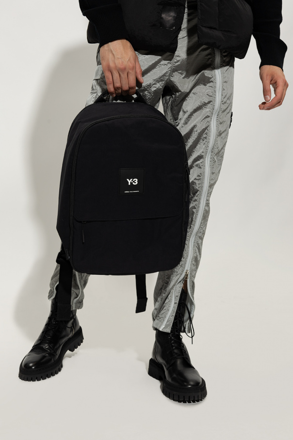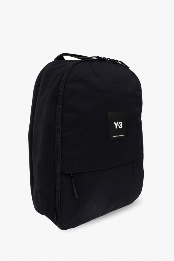 Black backpack from Y-3 Yohji Yamamoto. Emblazoned with a black and white logo patch, this design secures with a two-way zipper and features a zip front pocket, adjustable shoulder straps, black metal hardware and one internal compartment.