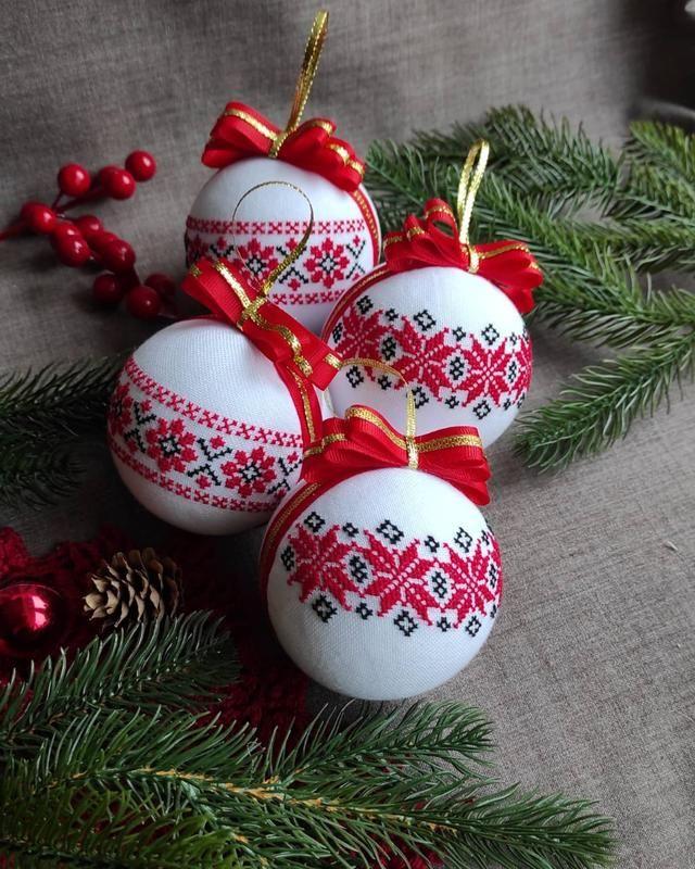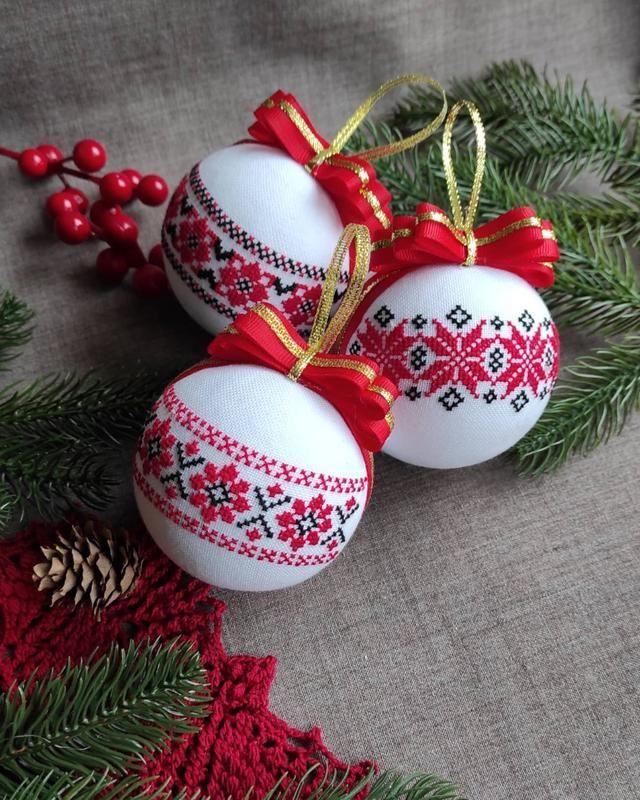 Новорічна кулька оздоблена вишивкою, вишивка одностороння, діаметр кульки 8 см, вишивка хрестиком, ручна робота. Термін виконання обговорюється індивідуально