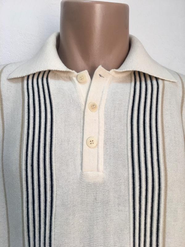 рукавов и низ изделия под резинку .Цвет белый с редкими тоненькими вертикальными черными полосками .