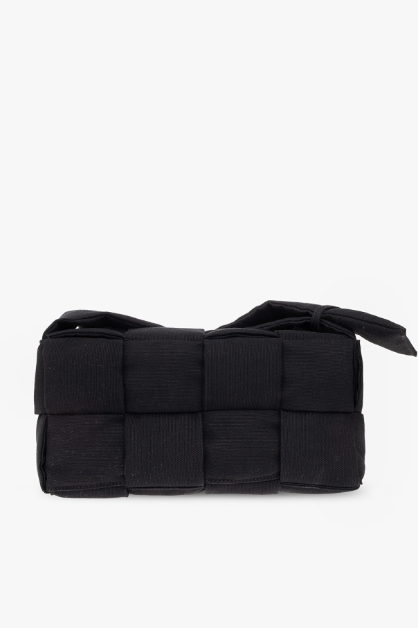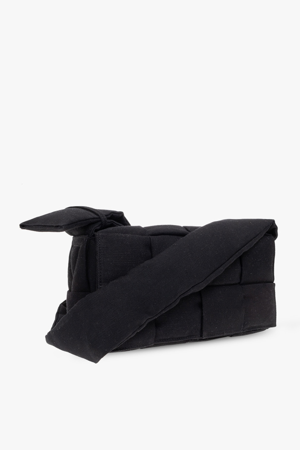 Black ‘Cassette Medium’ shoulder bag from Bottega Veneta. Crafted from a cotton and linen blend with the brand's signature ‘Intreccio’ weave, this design features a flap with a magnetic fastener, an adjustable strap, silver-tone metal hardware and one internal compartment with a removable zip pouch.