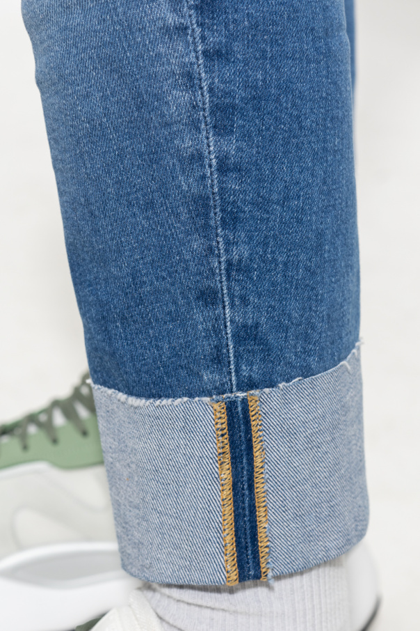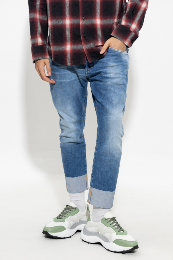 Blue ‘Sailor’ jeans from Dsquared2, the ‘One Life One Planet’ collection. Made from cotton, this pair features button fastenings, distressed details, classic five pockets, turn-up hems and a yellow and purple logo patch at the back.