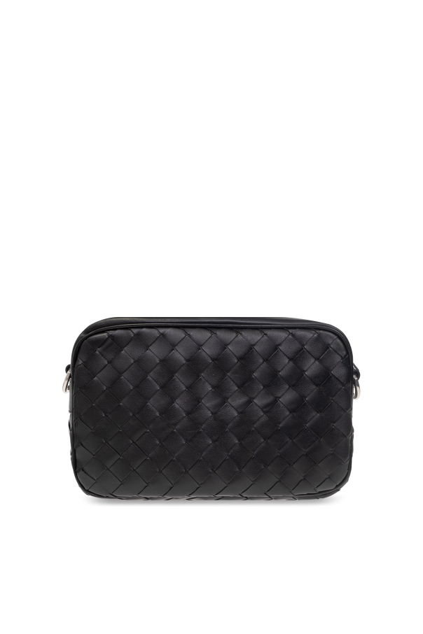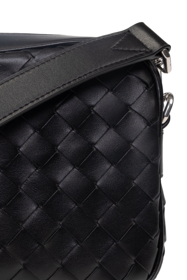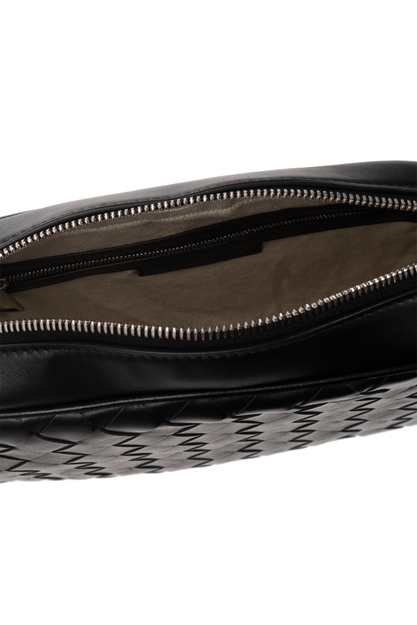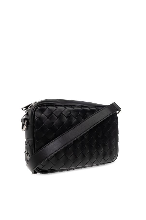 Black shoulder bag from Bottega Veneta. Made of calf leather with the brand's signature Intrecciato weave, this design secures with a two-way zipper and features a detachable and adjustable shoulder strap, silver-tone metal hardware and one internal compartment with one zip pocket and one slip pocket.