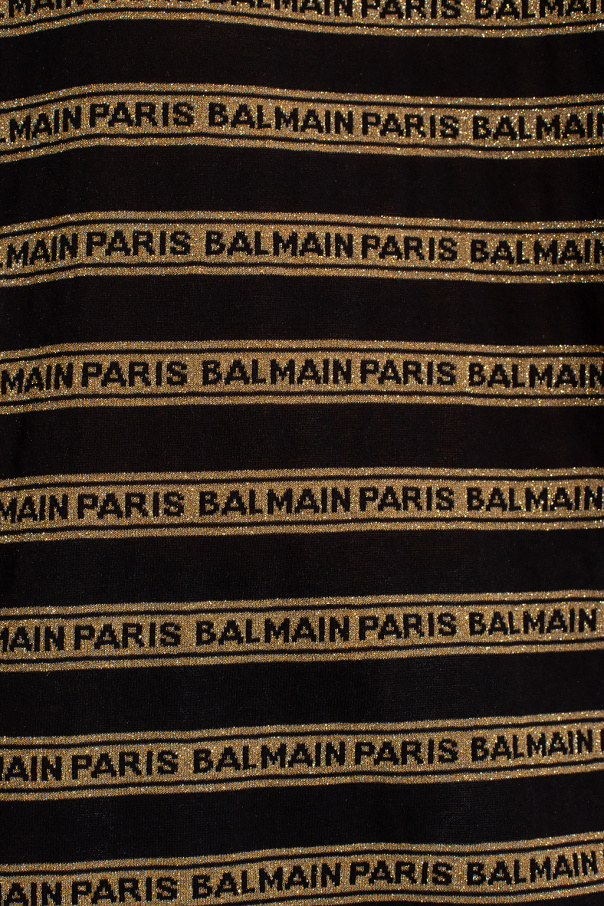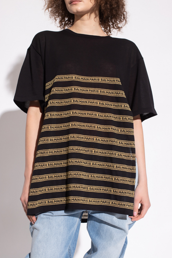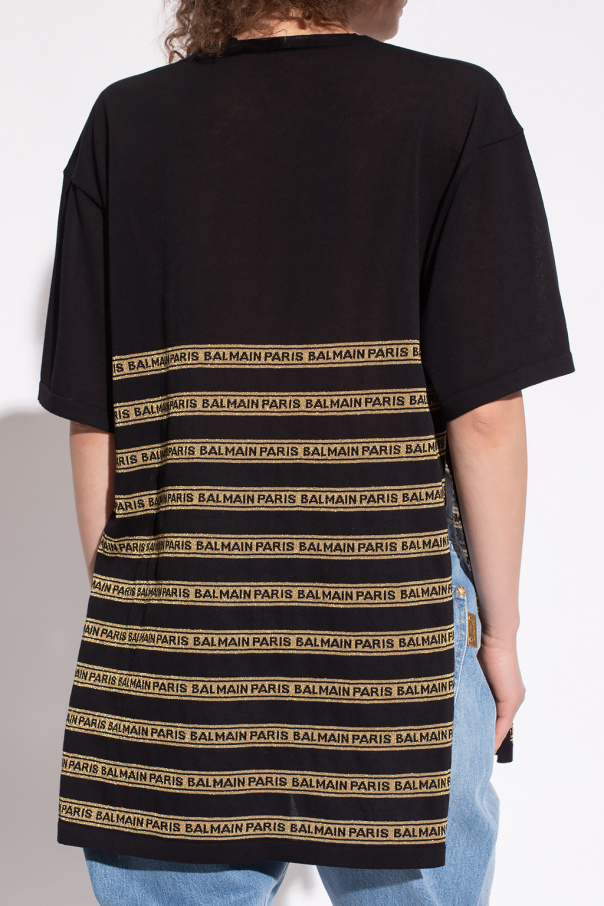 Black loose-fitting beach top from Balmain. Made of sheer fabric, this short sleeve design features a stripe pattern in gold-tone, logo embroideries, round neck with trimming and side slits.