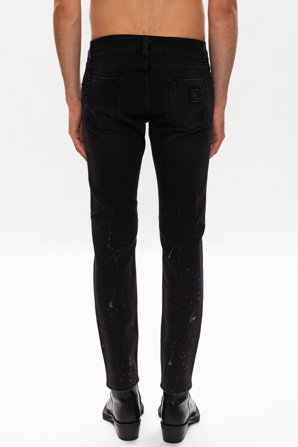 Black jeans with a raw edge from Dolce & Gabbana. Fastened with a button and zip, this design features a white paint splatter effect, logo details, three front pockets and two back pockets.