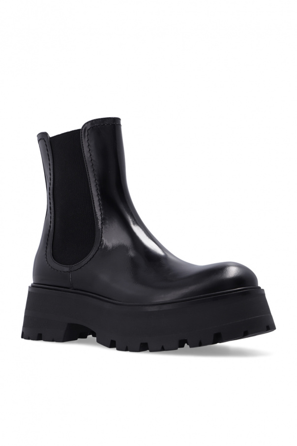 Black ankle boots from Alexander McQueen. Made of leather, this model features an almond shaped toe, elastic panels on the sides and a black rubber sole at the base.