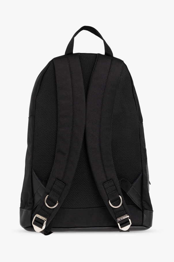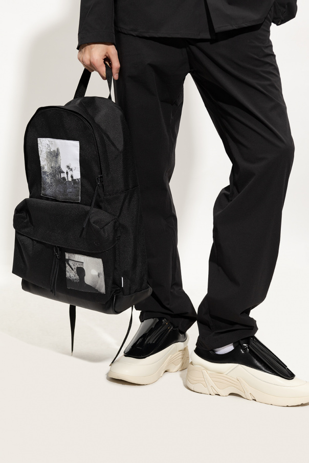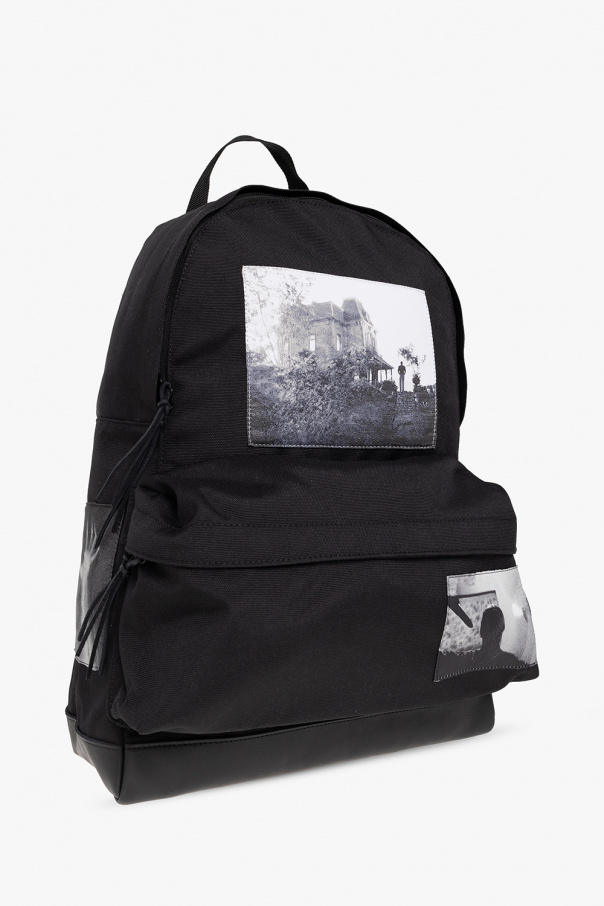Black backpack from Undercover. Emblazoned with patches, this design features a zip fastening, a zip front pocket, a half-round handle, adjustable shoulder straps, black metal hardware and one internal compartment with a zip pocket.