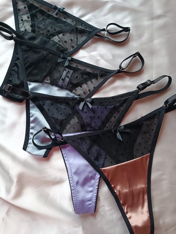 Зроблено в Україні?:Производство ,Материал:Сатин ,Модель трусиков:Стринги ,Декор:Сеточка , - Shipping