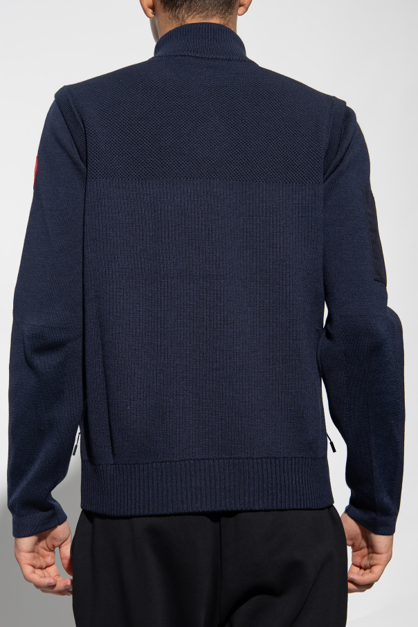 Navy ‘Stormont’ turtleneck sweater from Canada Goose. Crafted from wool, this design features a side zip and long sleeves with a zip pocket and a logo patch.