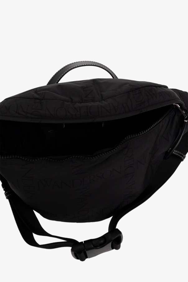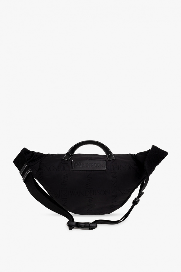 Black belt bag from JW Anderson. Made from cotton, this design secures with a zipper and showcases a logo pattern for brand recognition. It is complete with a half-round handle, an adjustable waist strap, silver-tone metal hardware and one internal compartment with a slip pocket.