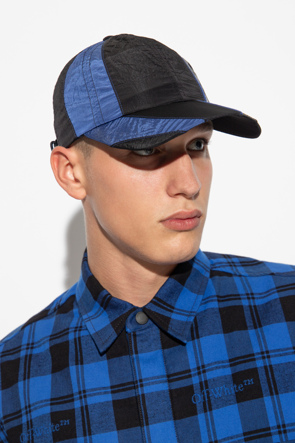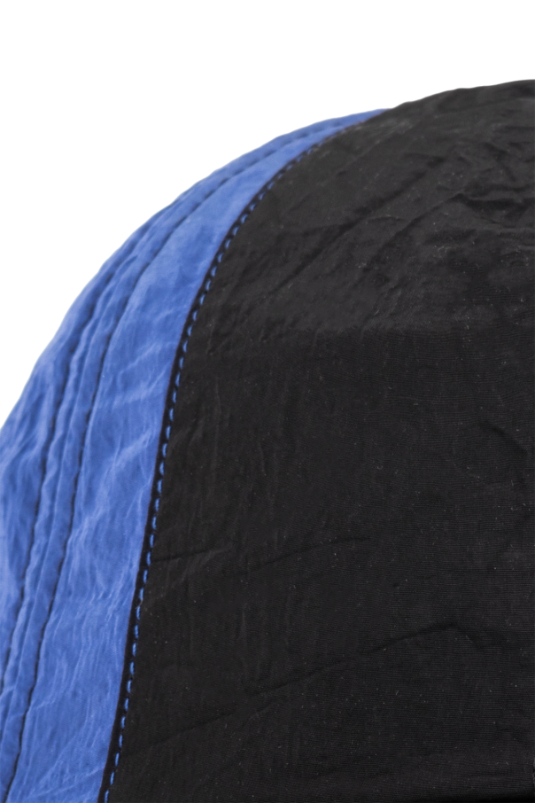 Black, grey and dark blue baseball cap from Ader Error. Fastened with a magnetic snap, this item is decorated with a stripe pattern and rubber logo patch.