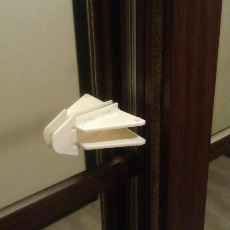 Защита, замок блокиратор на шкаф купе для безопасности Вашего ребенка. Защита сделана в виде бабочки, при поднятии крылышек двери зафиксированы и не открываются, при опускании двери шкафа свободно раздвигаются.
