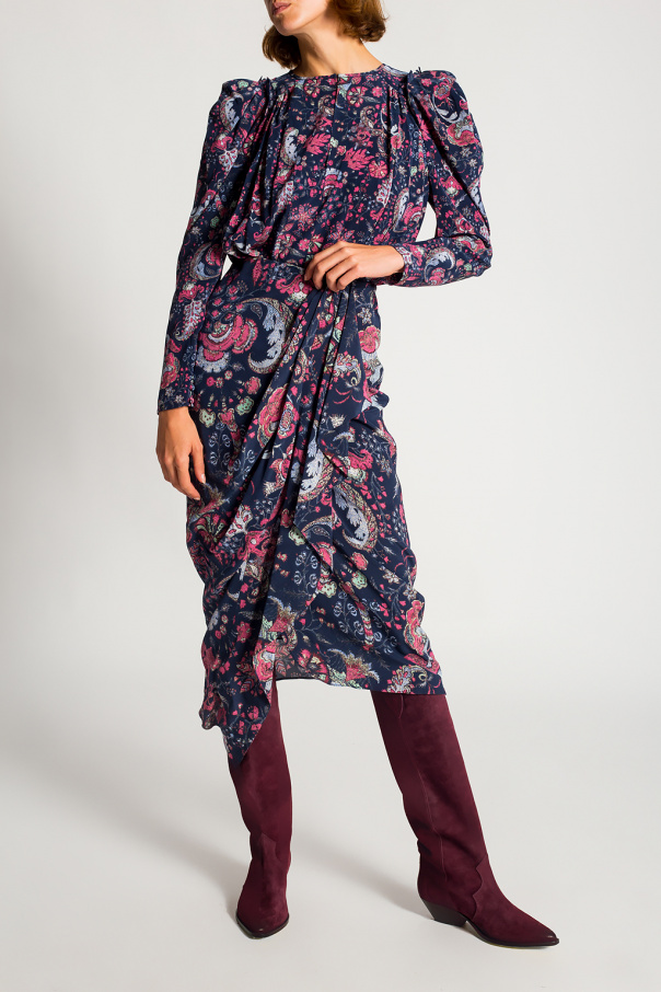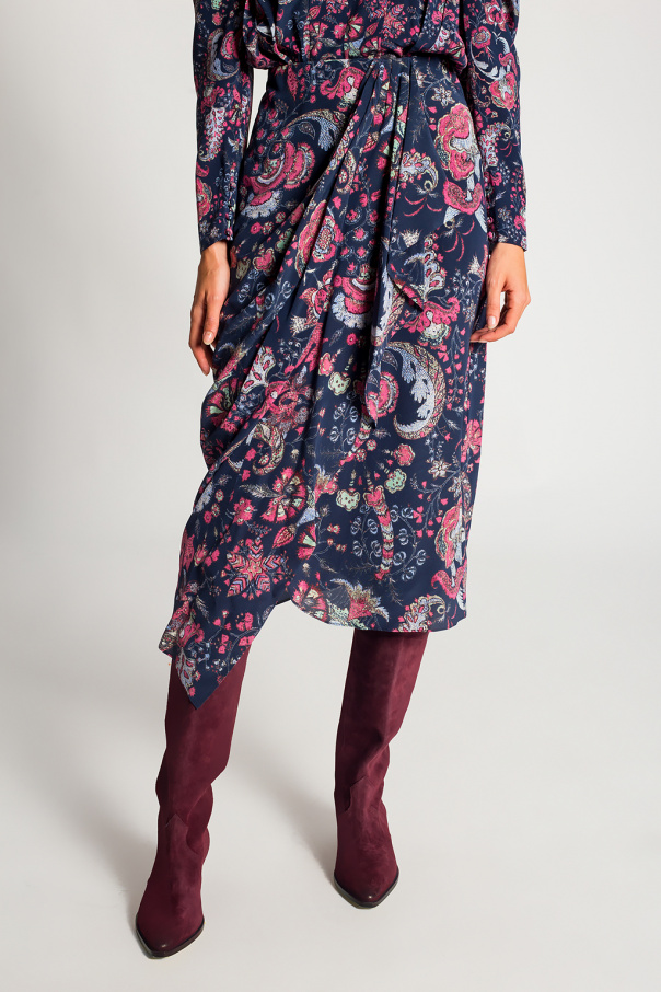 Navy blue, green and pink skirt from Isabel Marant. Embellished with a floral pattern, this silk-crafted style features an elasticated waistband and a frontal slit for walking ease.