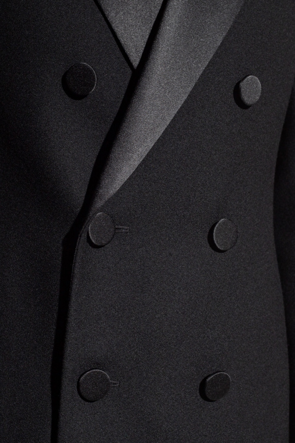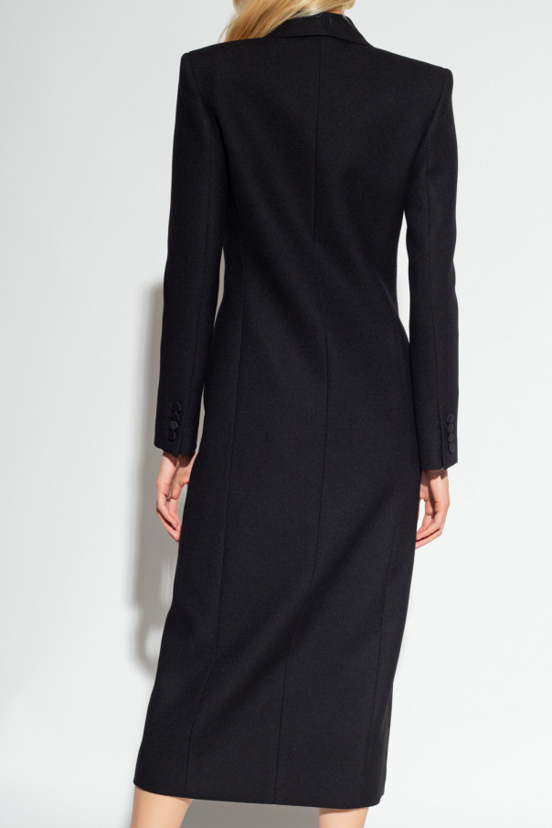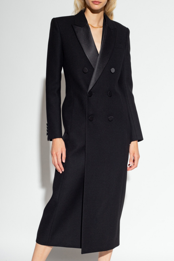 Black double-breasted coat from Saint Laurent. Made of wool, this garment features button fastenings, three slip pockets, peak lapels with a satin finish, padded shoulders and long sleeves with buttoned cuffs.