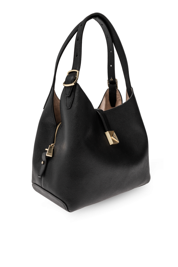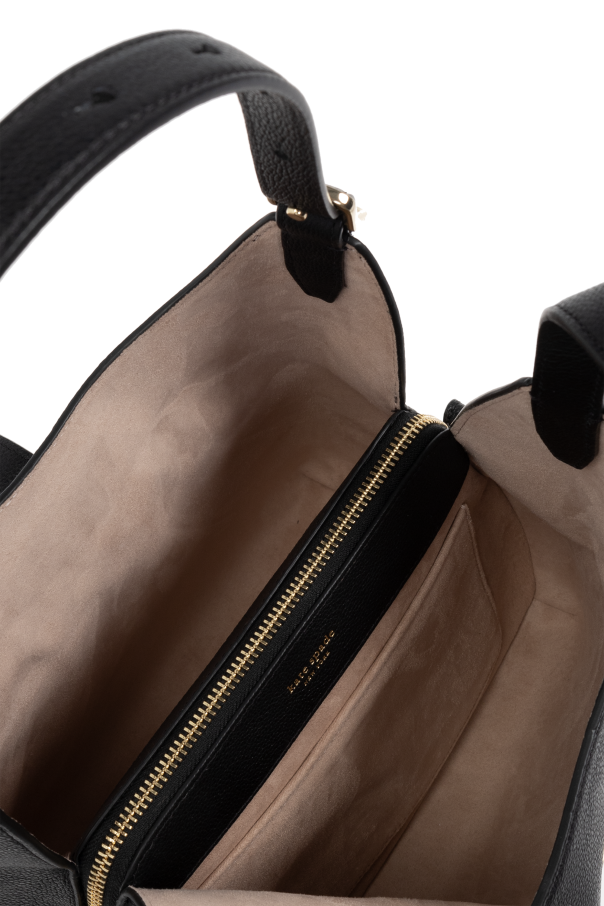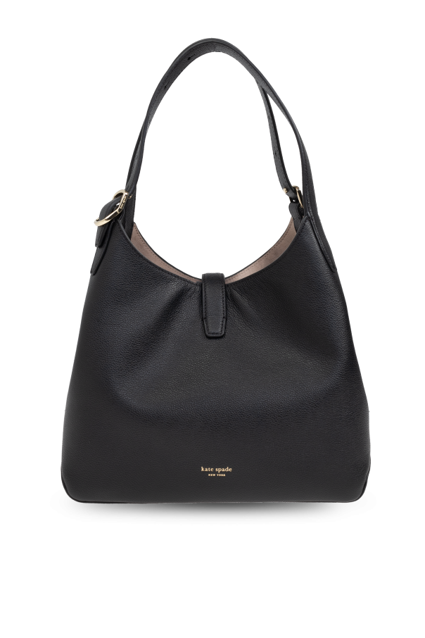 Introducing the Deco Shoulder Bag, a masterfully crafted accessory that epitomizes elegance and sophistication. Designed by the illustrious Kate Spade, this spacious bag is the perfect blend of functionality and timeless style. Constructed from premium black leather, the Deco Shoulder Bag boasts a classic trapezoidal shape that tapers gracefully towards the top. The exterior is adorned with a distinctive gold square detail, engraved with the designer's logo, adding a touch of opulence to its sleek silhouette. The bag features dual handles, allowing for versatile carrying options, whether on the shoulder or by hand. Inside, the bag is lined with a light-colored fabric, facilitating easy location of items. The interior is thoughtfully designed with a compartment, a zippered pocket, and an additional slip pocket, ensuring superb organization. The adjustable straps with metal buckles further enhance its practicality, allowing for a customized fit. Why Choose This Product? Crafted from high-quality black leather for a luxurious, timeless appeal. Elegant gold detailing with engraved designer logo for a distinctive look. Spacious interior with multiple compartments for optimal organization. Versatile carrying options with dual handles and an adjustable, detachable strap.