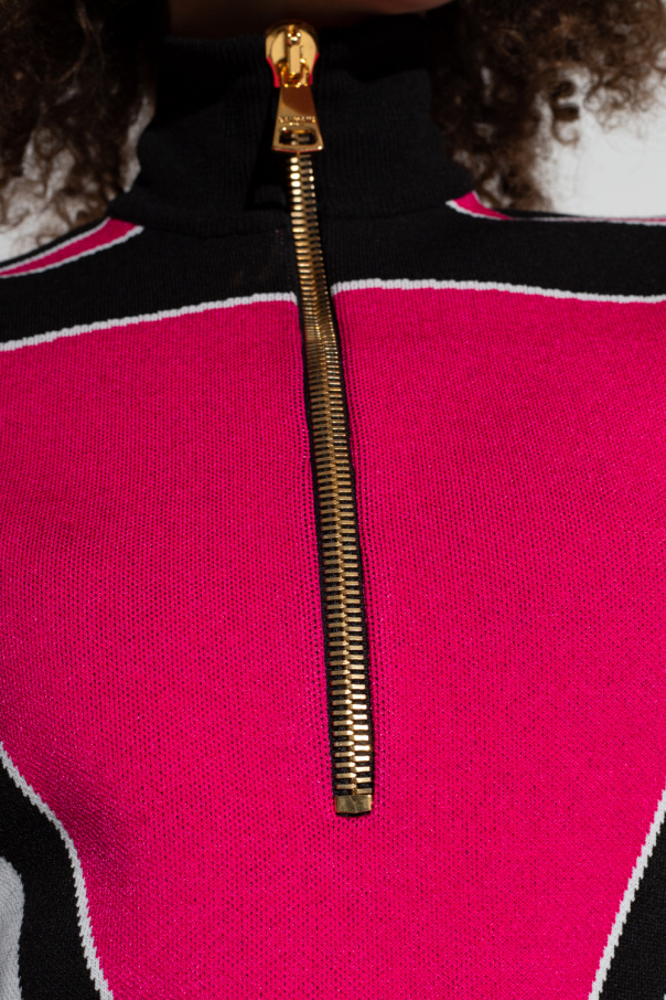 Black, pink and white sweater from Balmain. Crafted from a wool blend with a cable-knit, this style features a form-fitting silhouette, a standing collar with a zip closure, geometrical prints, logo patches on the front and back an ribbed trims on the bottom hem and cuffs.