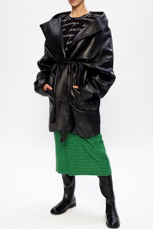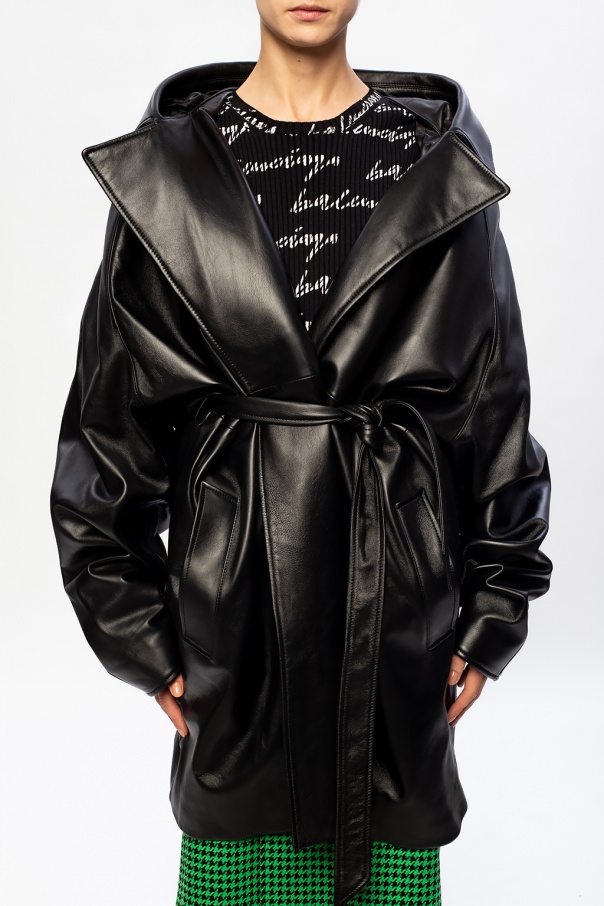 Black coat from Balenciaga. Crafted from calf leather, this garment features a tie belt at the waist and two slip pockets on the front.