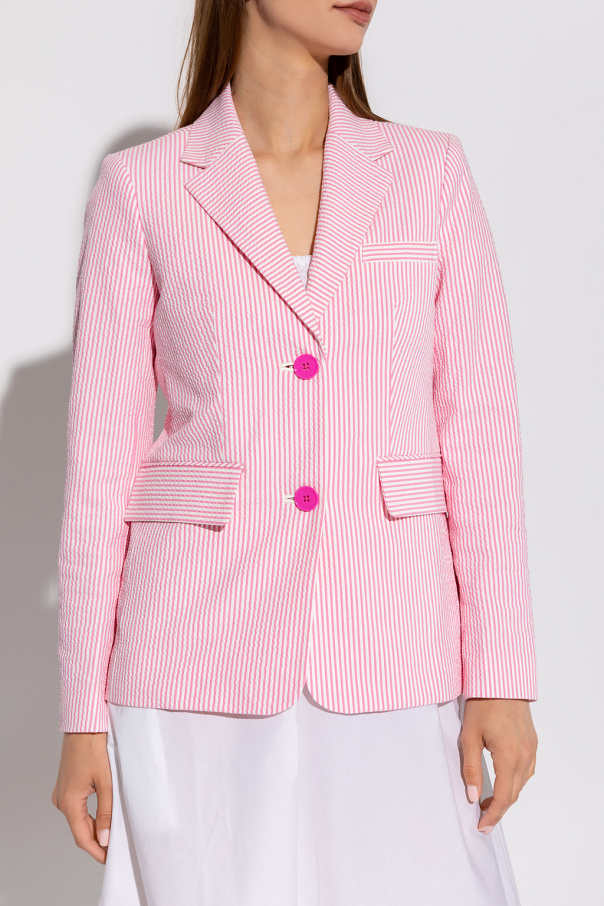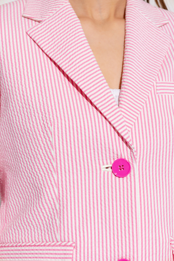 White and pink fitted blazer from Kate Spade. Made of cotton. Fastened with buttons, this garment features a stripe pattern, notch lapels, two flap pockets, one slip pocket, single rear vent and long sleeves with button cuffs.