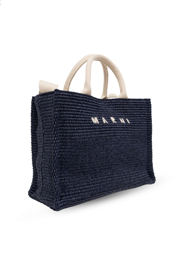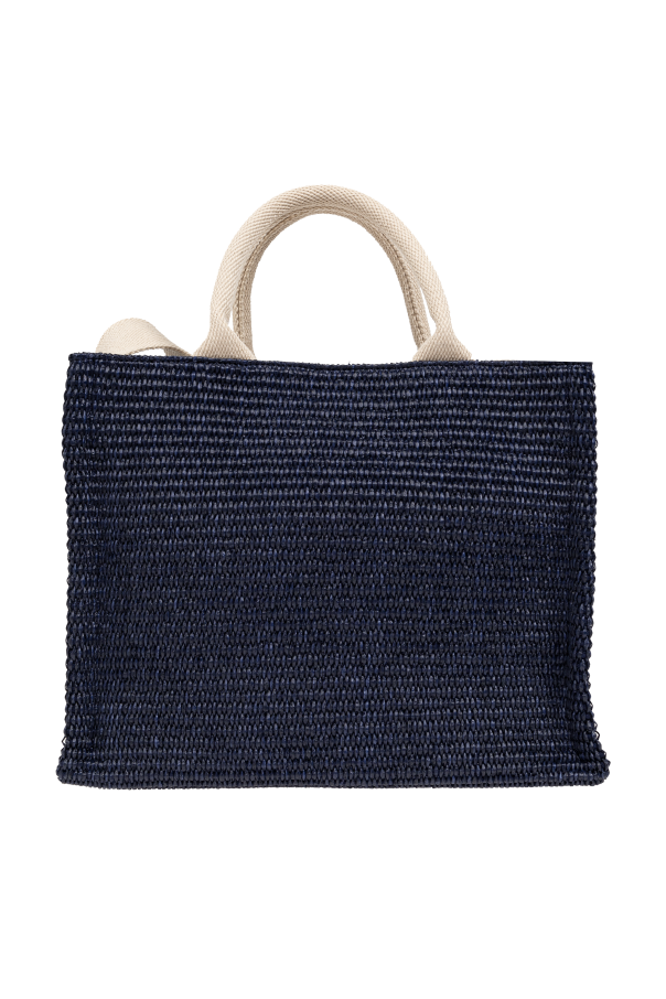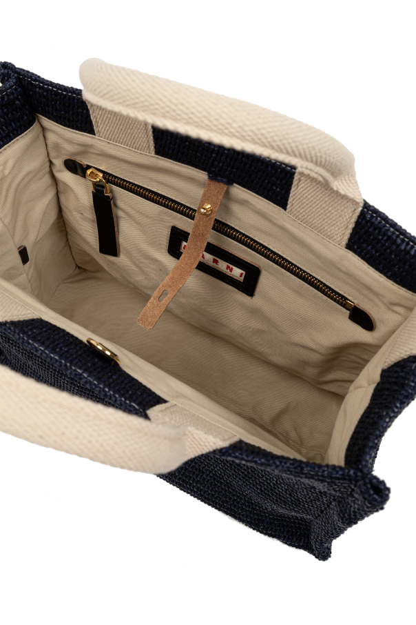 Introducing the Marni Navy Shopper Bag, an epitome of refined aesthetics and functionality. Crafted with meticulous attention to detail, this shopper bag showcases a woven exterior with a distinct, horizontal texture that elevates its rectangular, flat-profile design. The deep navy hue is beautifully contrasted by a crisp, white designer logo, making it an emblem of luxury and brand recognition. The bag's handles, crafted from a material in a light hue, along with an accompanying adjustable shoulder strap, offer versatile carrying options, enhancing its practical elegance. The interior, lined in a complementary light shade, is thoughtfully organized with additional pockets, including a zippered compartment, ensuring your essentials are neatly stored and easily accessible. Leather zip pulls and a branded interior label underscore the bag's exquisite craftsmanship. Materials blend sophistication with durability, combining a 52% cotton and 48% polyamide outer layer with a 95% cotton and 5% acrylic inner lining, accented with calf leather and metal details. This navy and cream woven shopper, complete with a sleek closure strap, radiates timeless style while providing ample space for daily essentials. Why Purchase This Product? Exclusive Design: Showcases the iconic Marni logo set against a luxurious, textured background. Versatile Carrying Options: Comes with both short handles and an adjustable shoulder strap for comfort and style. Organized Interior: Features a zippered pocket for secure storage of valuables. Premium Materials: Crafted from a high-quality blend of cotton, polyamide, and accented with leather and metal details for lasting use. Elegant Detailing: Skilled craftsmanship evident in every detail, from the leather zip pulls to the light-colored lining.