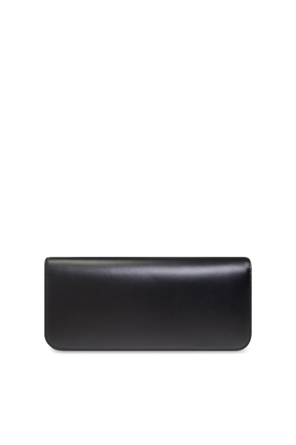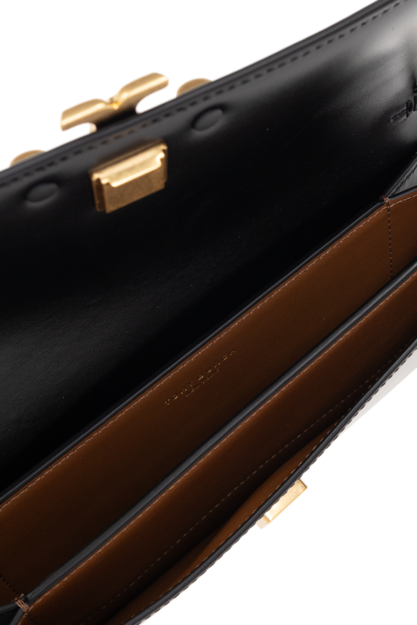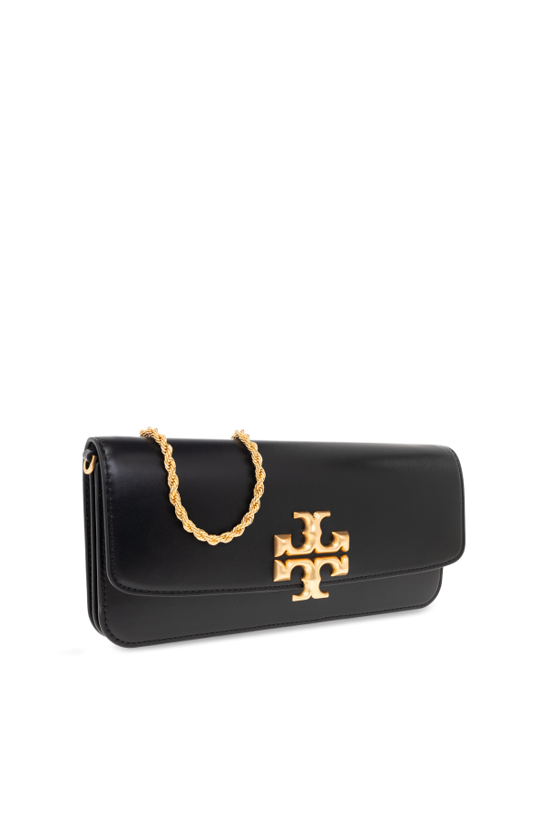 Black ‘Eleanor’ clutch from Tory Burch. Made of leather, this item features a magnetic closure with a metal logo detail, detachable shoulder chain, gold-tone metal hardware and three separate internal compartments.