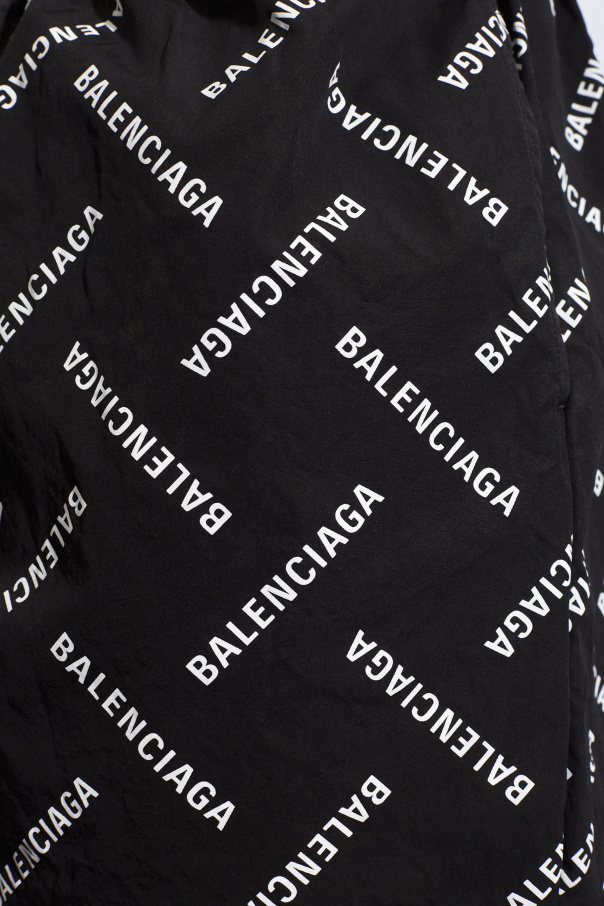 Black shorts from Balenciaga. Made of cotton, this pair is embellished with a white logo pattern and patch and features a drawstring waistband, three slip pockets and button closures on the front.