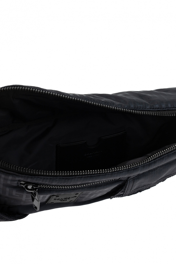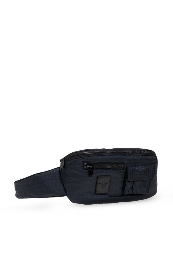 Black belt bag from Balmain. Fastened with a zip, this item features an embroidered logo pattern, appliqué, a zip pocket, snap-fastened flap pocket, adjustable belt, black metal hardware and one internal compartment with one card slot.