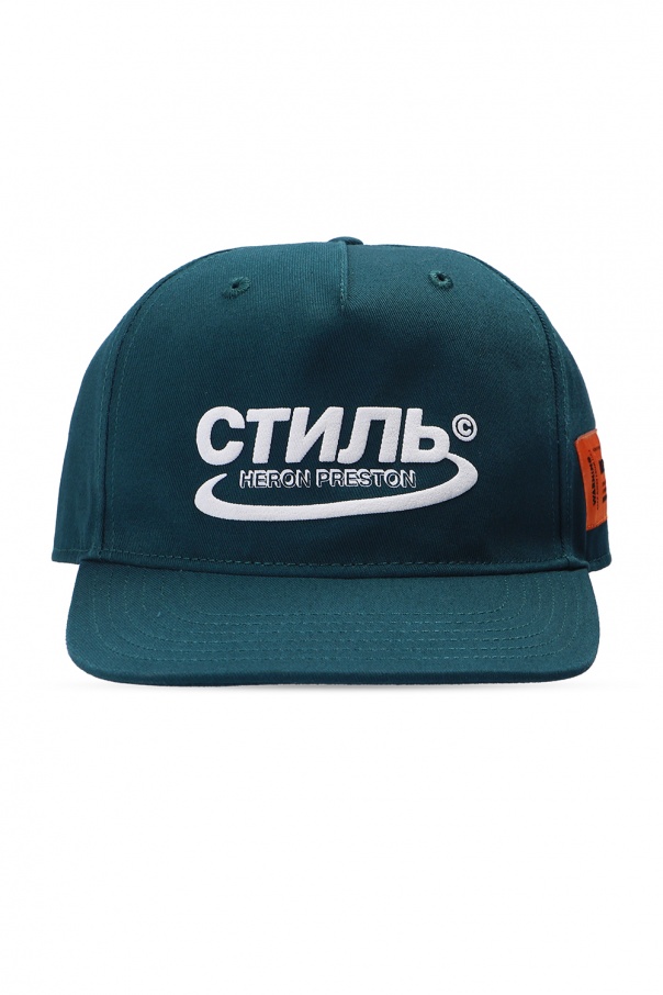 Green baseball cap from Heron Preston. Boasting an orange and black branded patch and a white logo print, this cotton-crafted piece of headwear is complete with a velcro fastener.