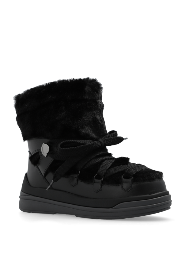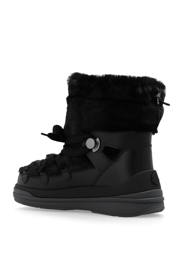 Black ‘Insolux’ snow boots from Maison Kitsune. Crafted from leather with faux fur trims, this pair features decorative lacing, drawstrings at the top, tactile logo at the back and a black rubber sole.