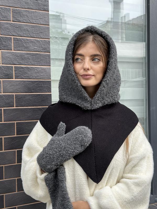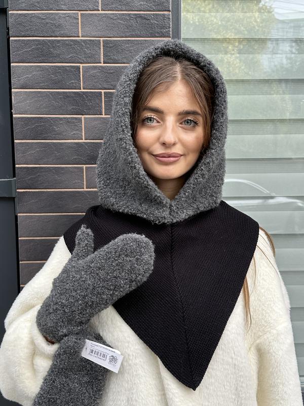 капором. Такий капюшон захистить від холоду не тільки голову, а й шию та плечіСтворіть гармонійний образ, додавши до капору рукавички (390грн)