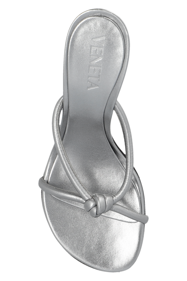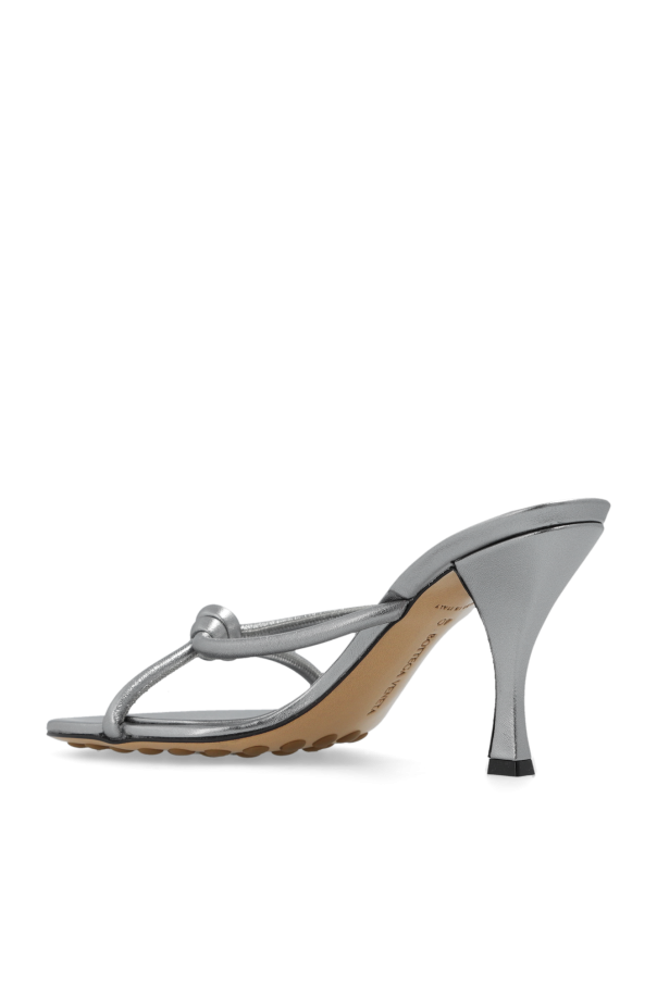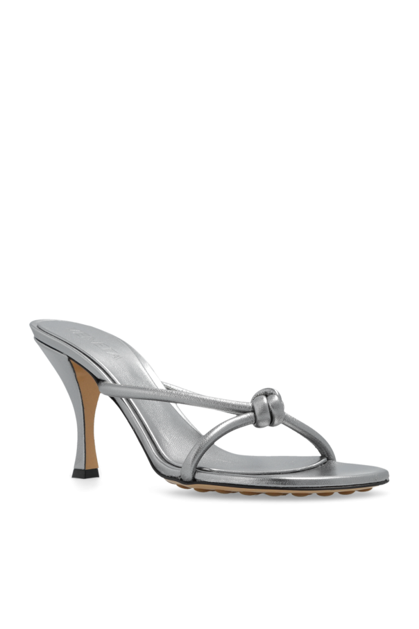 Silver-tone ‘Blink’ heeled mules from Bottega Veneta. Made of lamb leather, this pair features a decorative knot, rounded toe and beige rubber-injected leather sole for increased stability.