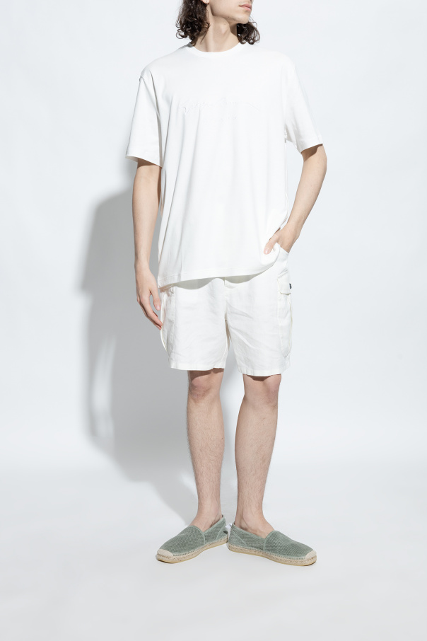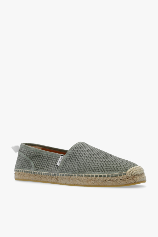 Greenish grey ‘Egon’ espadrilles from Jimmy Choo. Made of suede, this model sits on a beige sole in woven jute and rubber and showcases an embossed pattern and a logo patch.