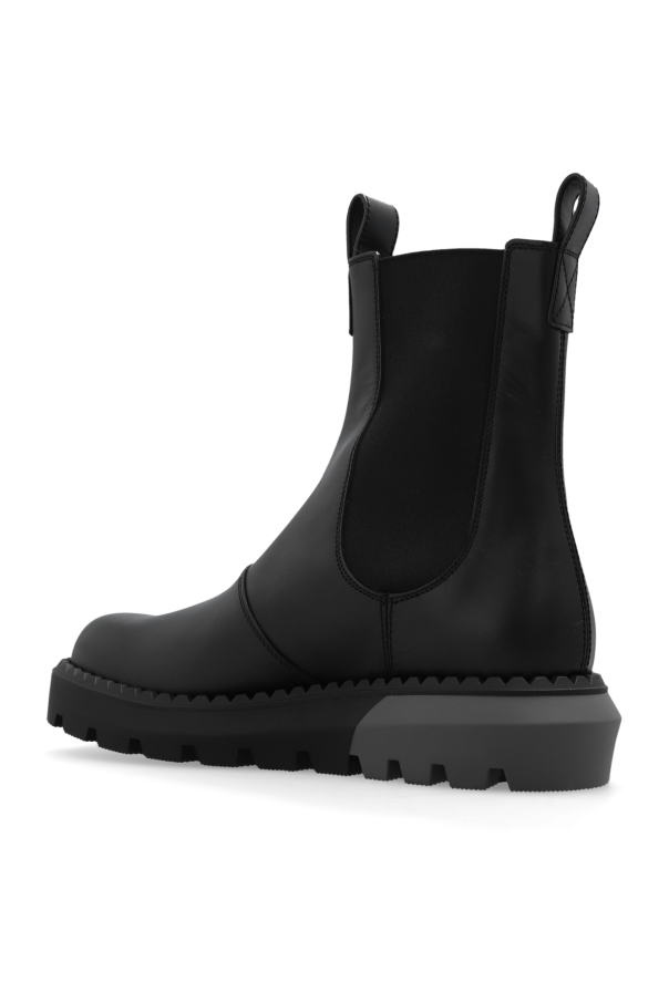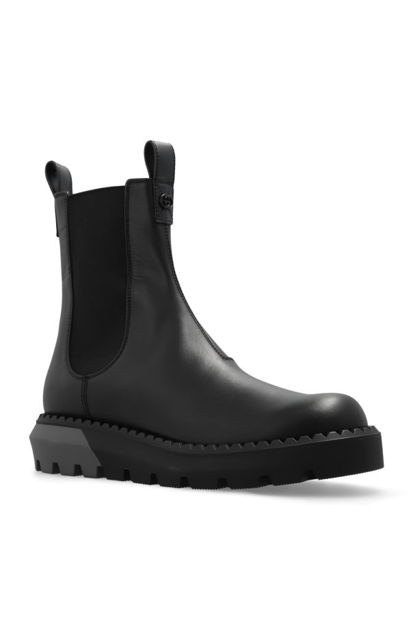 Black Chelsea boots from Gucci. Made of smooth calf leather, this model sits on a black and grey chunky rubber sole and features a logo-shaped application on the front and elastic panels on the sides.