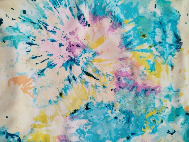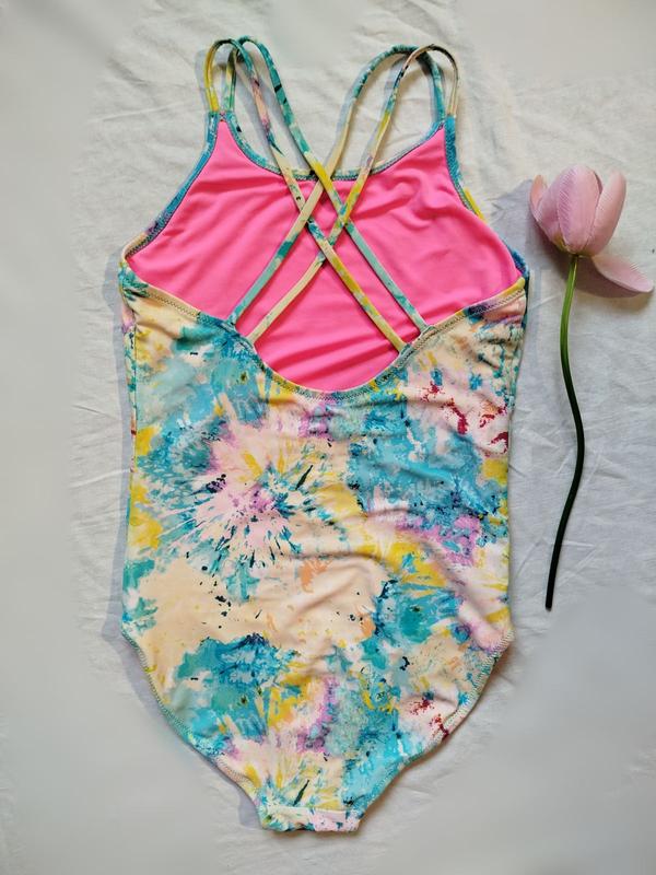 Цельный детский купальник с абстрактным акварельным цветным принтом. Нежные цвета – солнечный, голубой, розовый, персиковый, лавандовый и их оттенки. Тонкие двойные бретели перекрещиваются на спинке. Изнутри купальник полностью продублирован эффектной ярко розовой подкладкой.