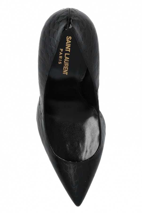 Black ‘Opyum’ pumps from Saint Laurent. Showcasing a YSL initials-shaped heel, this pair was made out of patent leather with a crocodile skin effect throughout and features a side zip fastening, a pointed toe and a black leather sole.