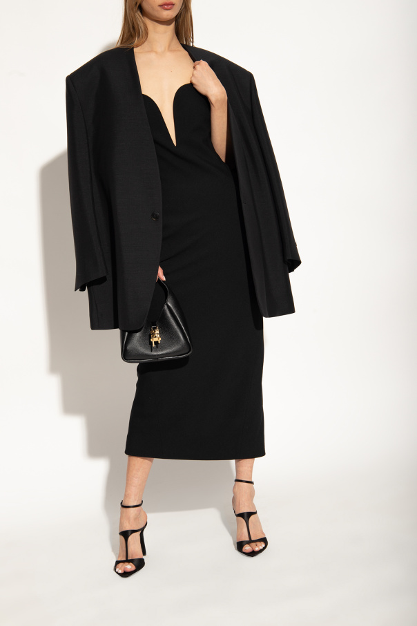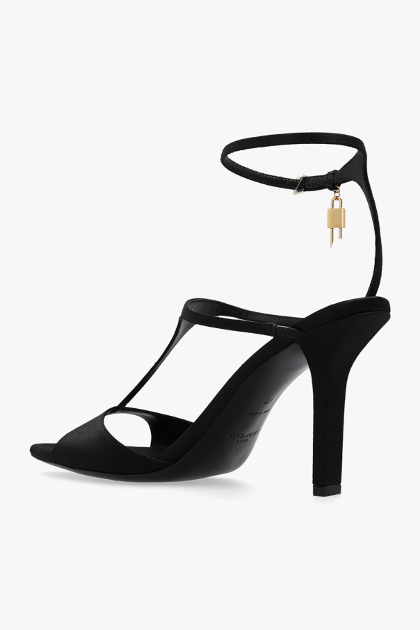 Black ‘G Lock’ heeled sandals from Givenchy. Crafted from fabric and leather, this model sits on a black leather sole and features a peep toe, satin trims and and a buckle strap at the ankle.