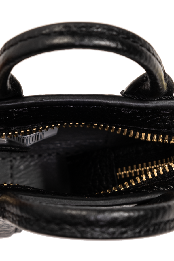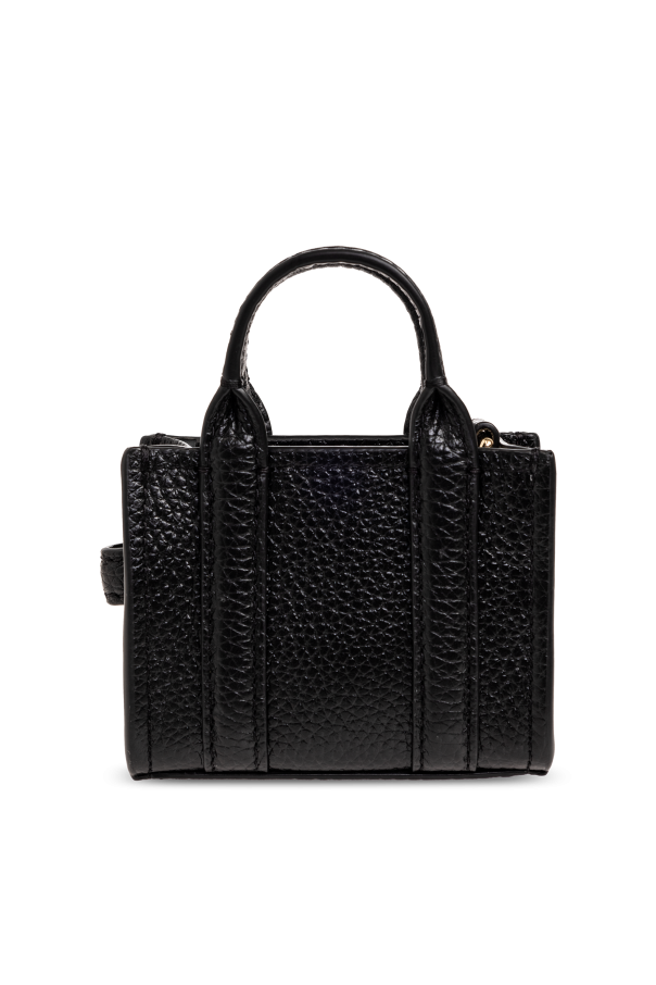 Introducing the 'The Tote Nano' keychain, a miniature marvel from the esteemed accessory collection by Marc Jacobs. This exquisite item, predominantly in black, boasts a material with a texture reminiscent of high-quality leather or its superior imitation, indicative of the luxury associated with Marc Jacobs' designs. The front of the keychain features an embossed inscription of the collection name, "THE TOTE BAG", alongside the designer's name, adding a touch of exclusivity and identity. Adorned with golden metallic elements, including a chain and clasp, this keychain exudes elegance while offering practicality. It can be effortlessly attached to keys or a handbag, serving not just as a decorative piece but a statement of style and sophistication. The craftsmanship is meticulous, with sharp lines and stitches that speak volumes of its high quality. Moreover, the presence of a metal zipper hints at a functional aspect - a small pocket or compartment within, further enhancing its utility and charm. Why Purchase This Product? Exclusively designed by Marc Jacobs, reflecting sophistication and high fashion. Made from premium material, suggesting the durability and elegance of leather. Features golden metallic details, adding a luxurious touch to any accessory collection. Practical functionality with its small compartment, perfect for holding tiny essentials. A distinctive piece that showcases style and elegance, making it an ideal gift or personal adornment.