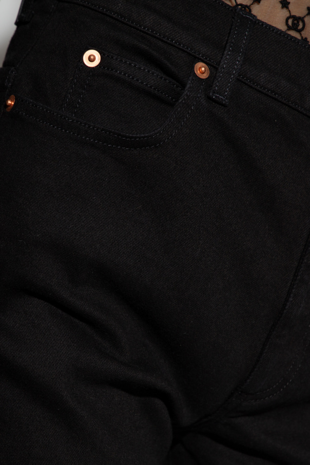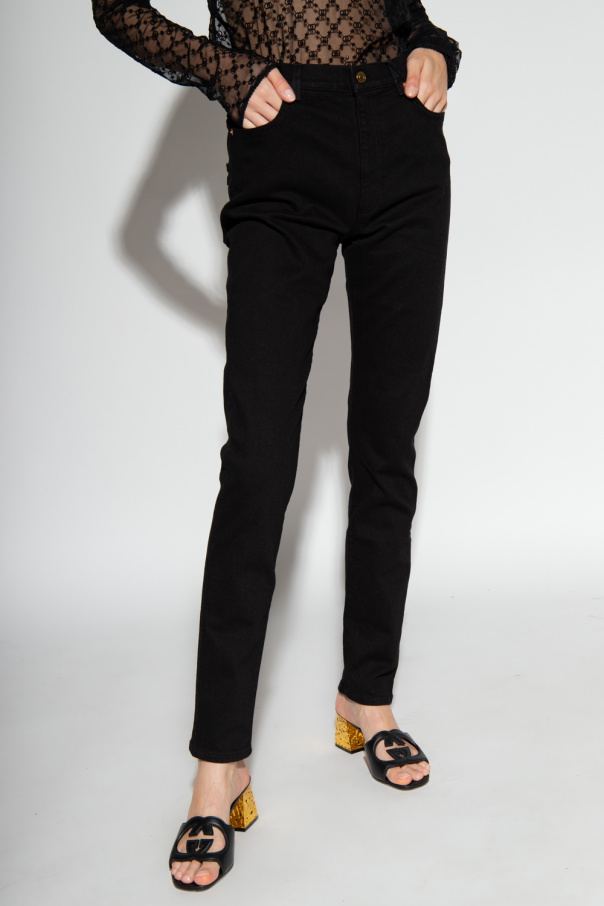 Black high-waisted jeans from Gucci. Fastened with a zip, this slim fit design features three front pockets and two back pockets with the brand’s signature metal horsebit appliqué in antique gold-tone.