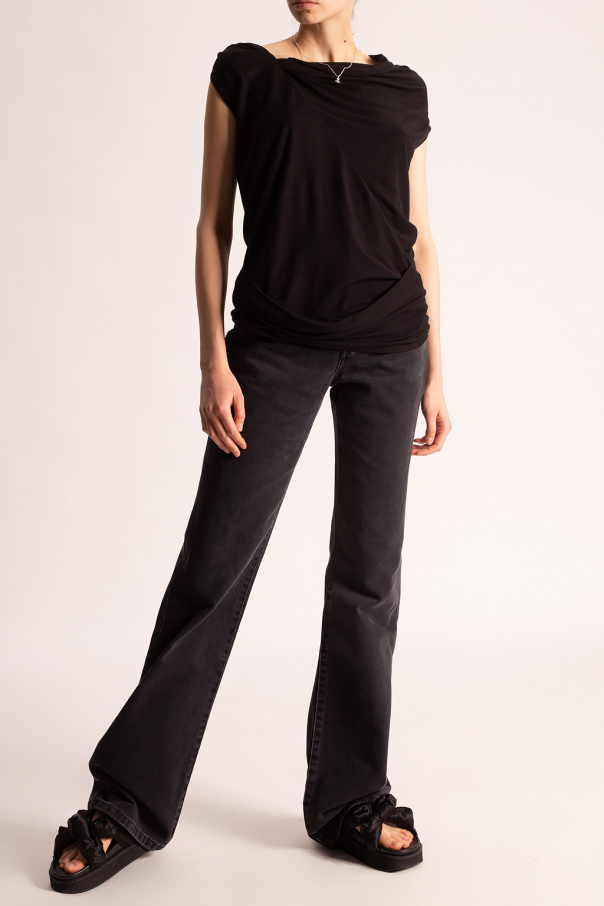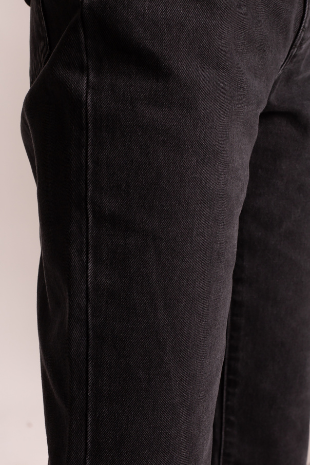 Black jeans from Raf Simons. Fastened with a zip fly and button, this high-waisted design is complete with three front pockets and two back pockets.