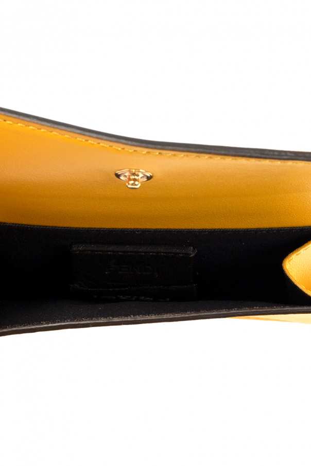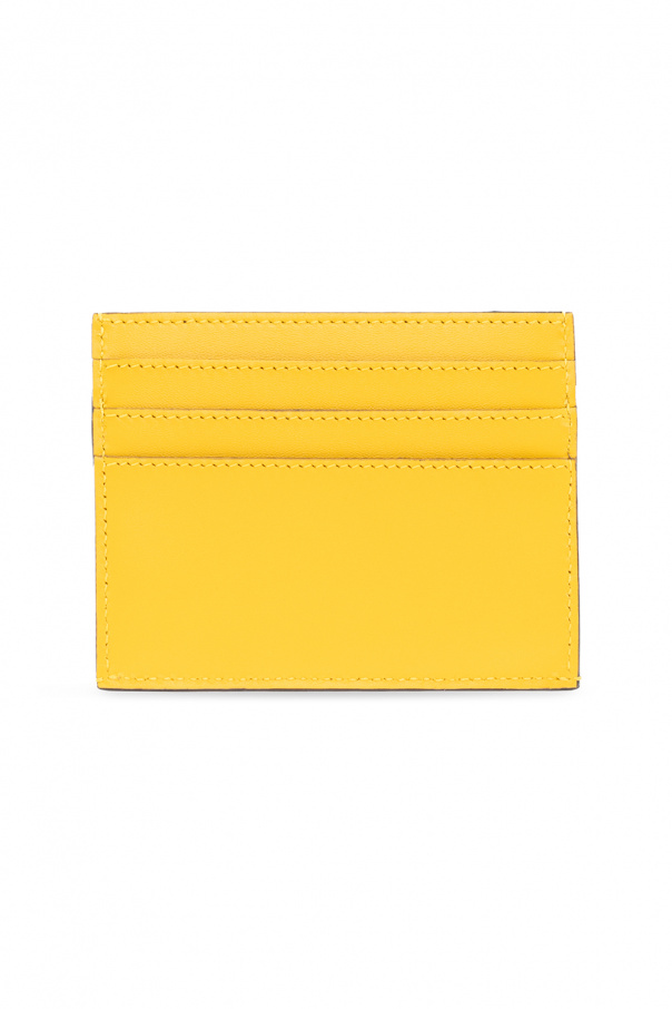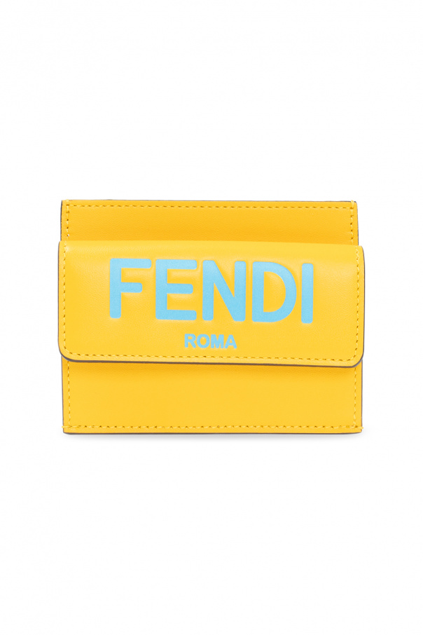 Yellow card case from Fendi. Crafted from leather, this item showcases an embossed logo pattern in blue. It is complete with an external snap-fastened pocket at the back, three card slots and one internal compartment.