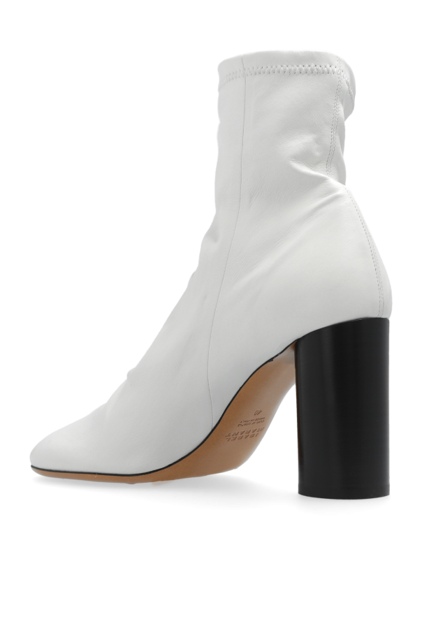 White ‘Labee’ heeled ankle boots from Isabel Marant. Made from leather with a slip-on silhouette, this model sits on a beige leather sole and features a round toe and a high circular heel.