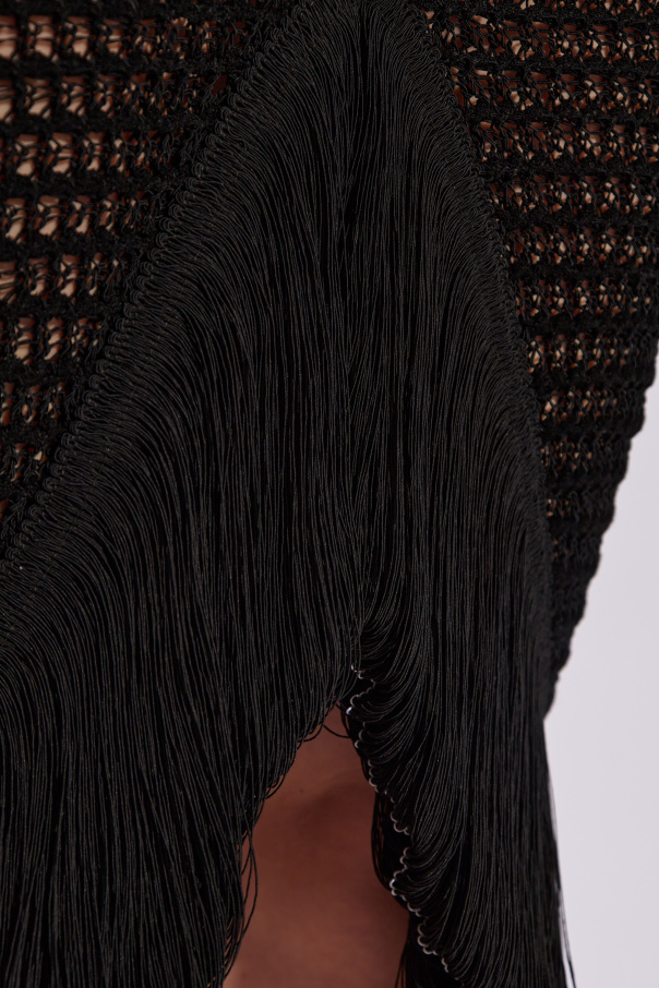 Introducing the epitome of sophisticated allure, the Boyfriend Ażurowa Skirt by the renowned designer Alaïa. This exquisite piece commands attention with its elegant, pencil silhouette and high-waisted design, making it a timeless addition to any discerning wardrobe. Crafted from a blend of premium materials, including cotton, viscose, polyamide, and polyester, this skirt showcases an intricate, openwork pattern that exudes a sense of delicate femininity and refined taste. The skirt's allure is further enhanced by its captivating black color and the addition of whimsical, fringed details at the hem, which inject a touch of whimsy and originality. The ażurowy (openwork) texture not only showcases the garment's exceptional craftsmanship but also hints at its suitability for special occasions, necessitating thoughtful coordination with the appropriate undergarments or a slip to navigate its subtly sheer nature with elegance. Upon closer inspection, revealed in the detailed imagery, the precision of the ażurowy pattern and the delicate fringes speak volumes of the high-quality execution of this design, underscoring Alaïa's commitment to excellence and innovation in haute couture. Why Purchase This Skirt? Exemplary craftsmanship and high-quality materials blend for enduring beauty. Unique openwork design offers a sophisticated, yet original aesthetic. Perfect for special occasions, providing an elegant and distinctive look. From the collection of Alaïa, a name synonymous with luxury and impeccable style.