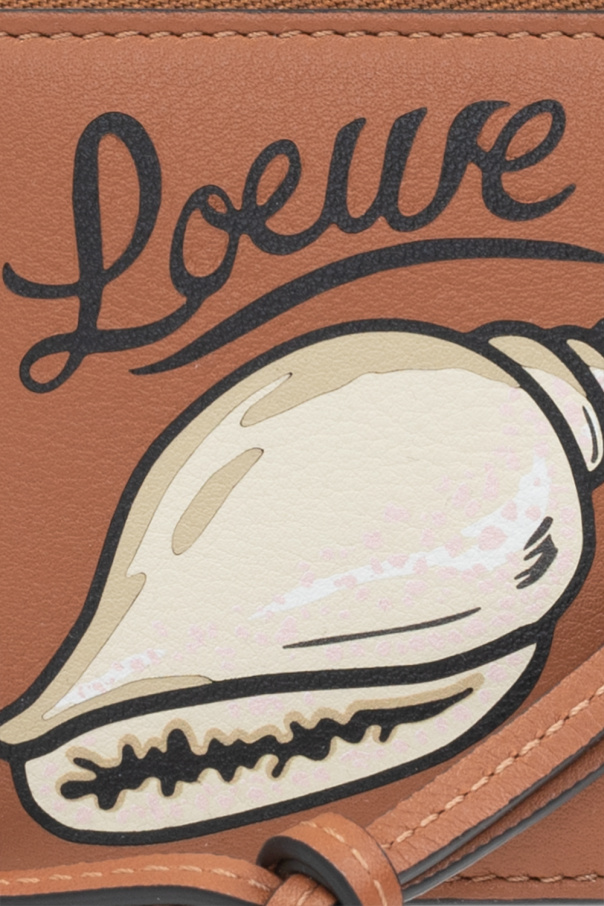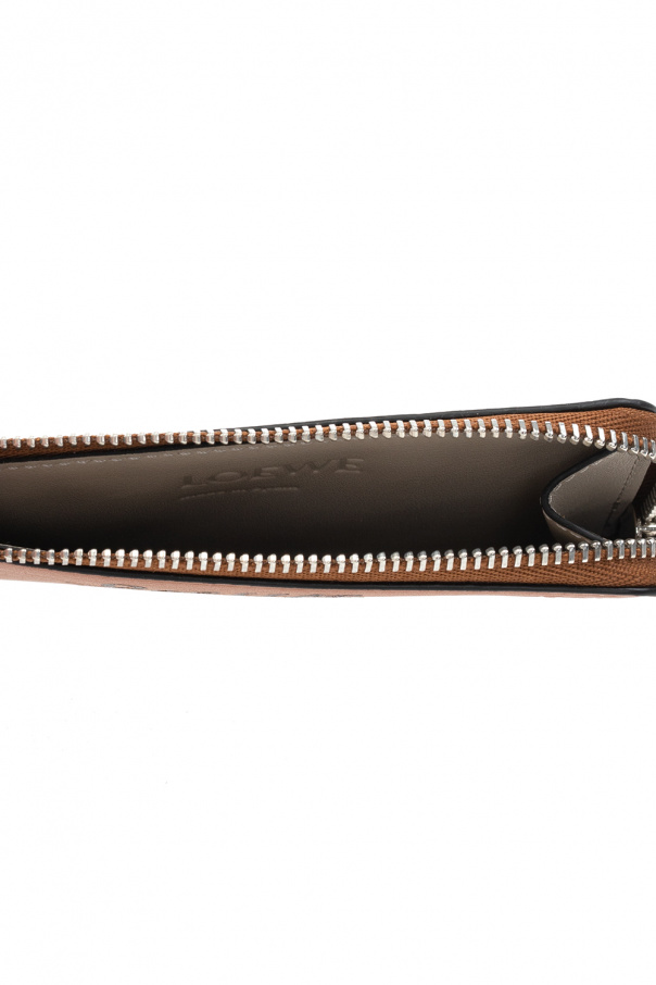 Brown card holder from Loewe x Paula's Ibiza. Crafted from leather, this design features a zip fastening, embossed and printed pattern, beige and black logo, four slip pockets and one internal compartment.