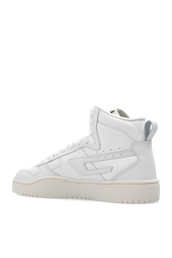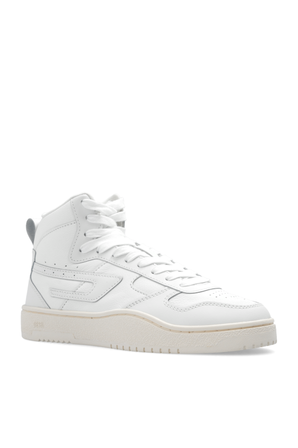 White ‘S-UKIYO’ high-top sneakers from Diesel. Made from cow leather, this lace-up model sits on a cream rubber sole and features a logo patch and perforations.