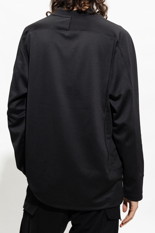 Black football-inspired V-neck T-shirt with a rubberized logo, patch and long sleeves from Y-3 Yohji Yamamoto. Model made partially from recycled materials recovered during the manufacturing process, such as scrap materials and household waste, to avoid the much greater environmental impact of raw material production.